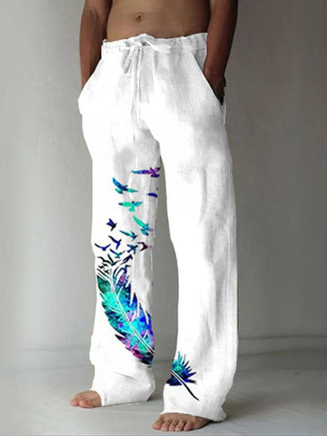 Men's Casual Cotton Linen Feather Print Drawstring Casual Trousers