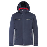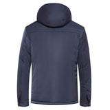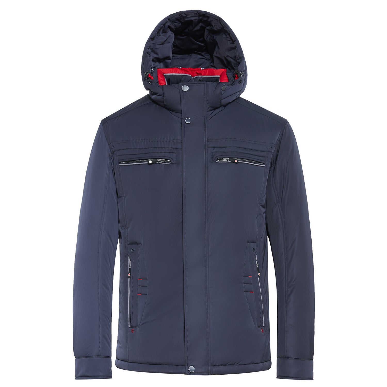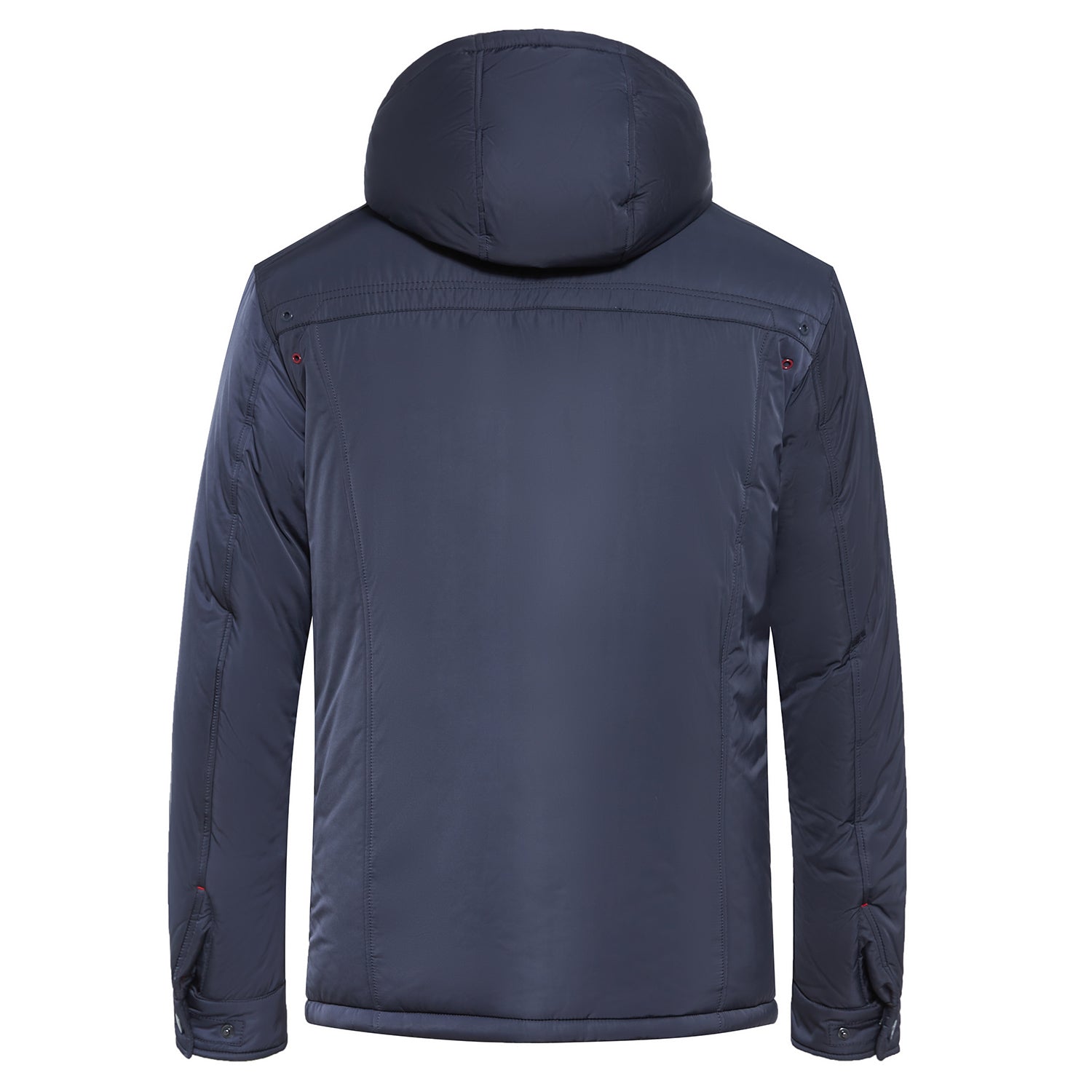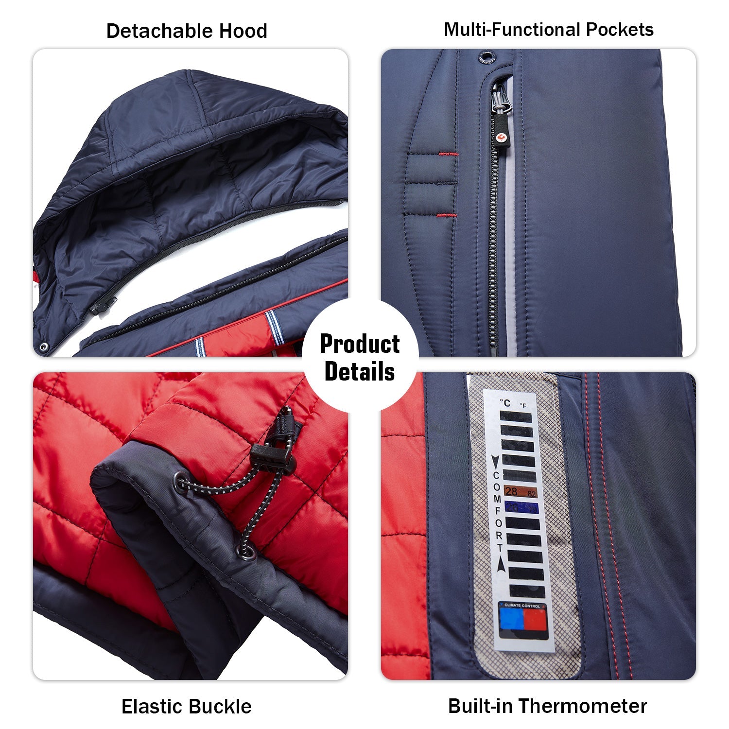 This jacket is a straight-cut. lined with extra thick camel hair as padding. the whole jacket is very warm. The built-in thermometer can help you see how well the jacket keeps you warm. The jacket is designed with an adjustable and removable hood. two outside pockets. two zipper pockets on the chest. and two invisible pockets on the inside.