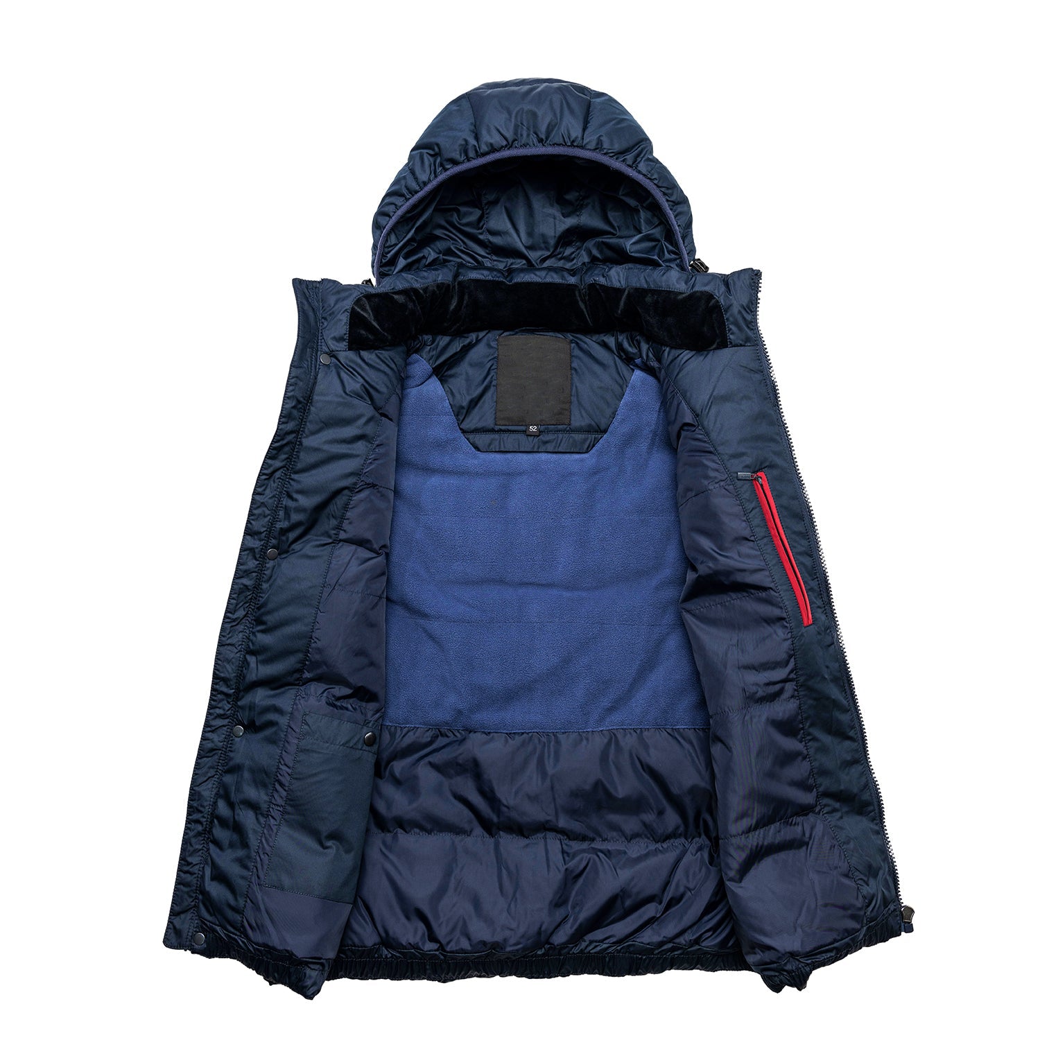 Detachable hooded vest with high collar and adjustable hood. has two welt pockets at front and two pockets inside. Featuring front hidden zip closure by a snap button flap.
