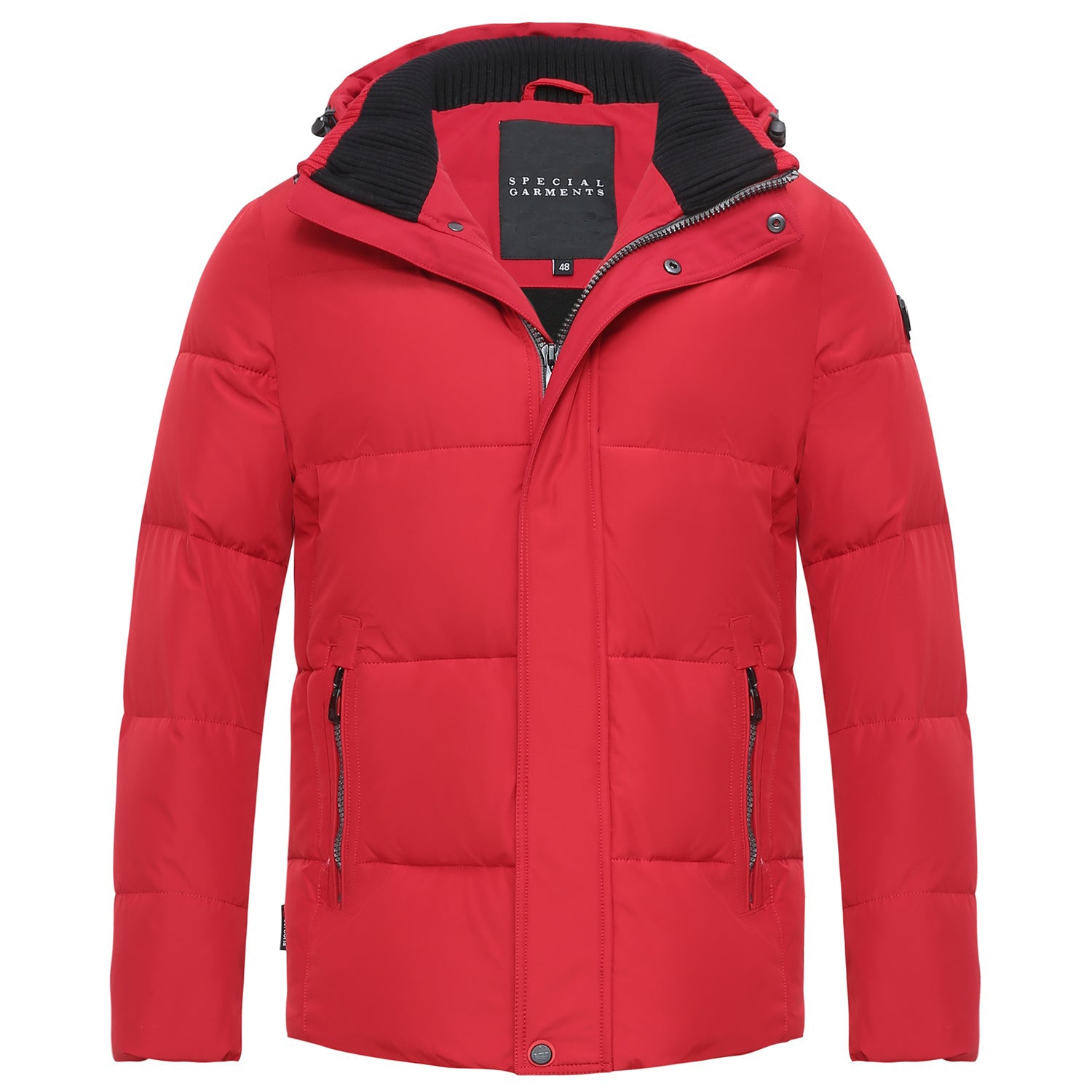 The clean-lined design makes it a versatile piece that goes well with more dressed and casual styles alike. Featuring zip front with press-button placket. two slanted zip pockets at front and two interior pockets. Elastic bands at the cuffs and collar can resist cold weather.