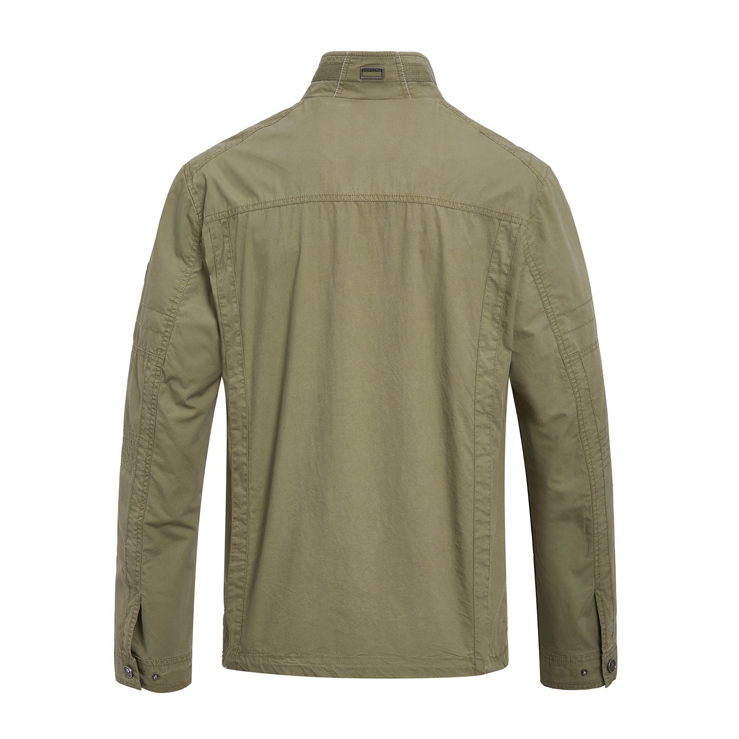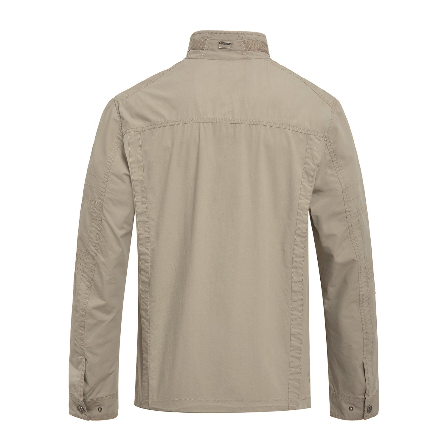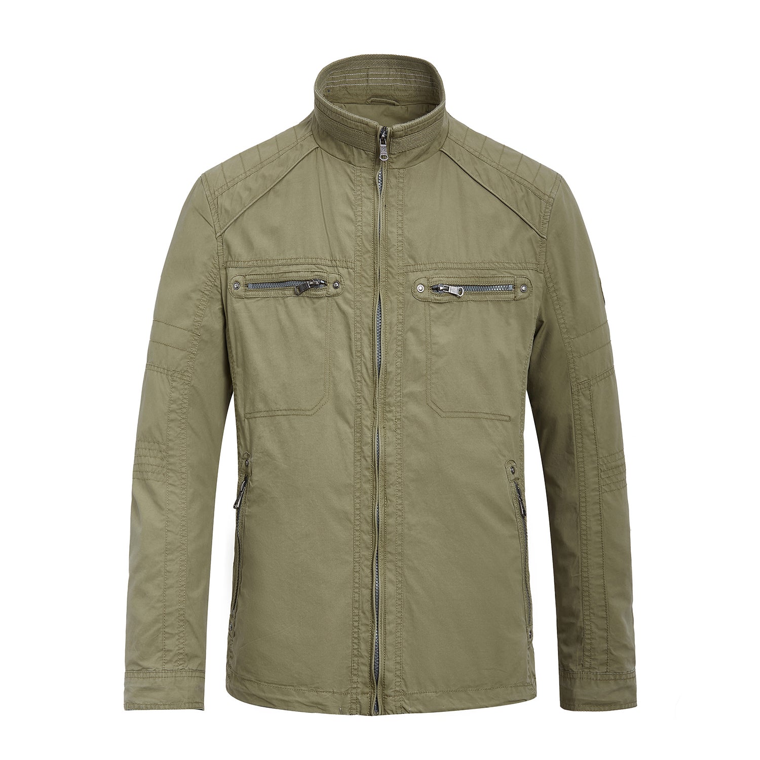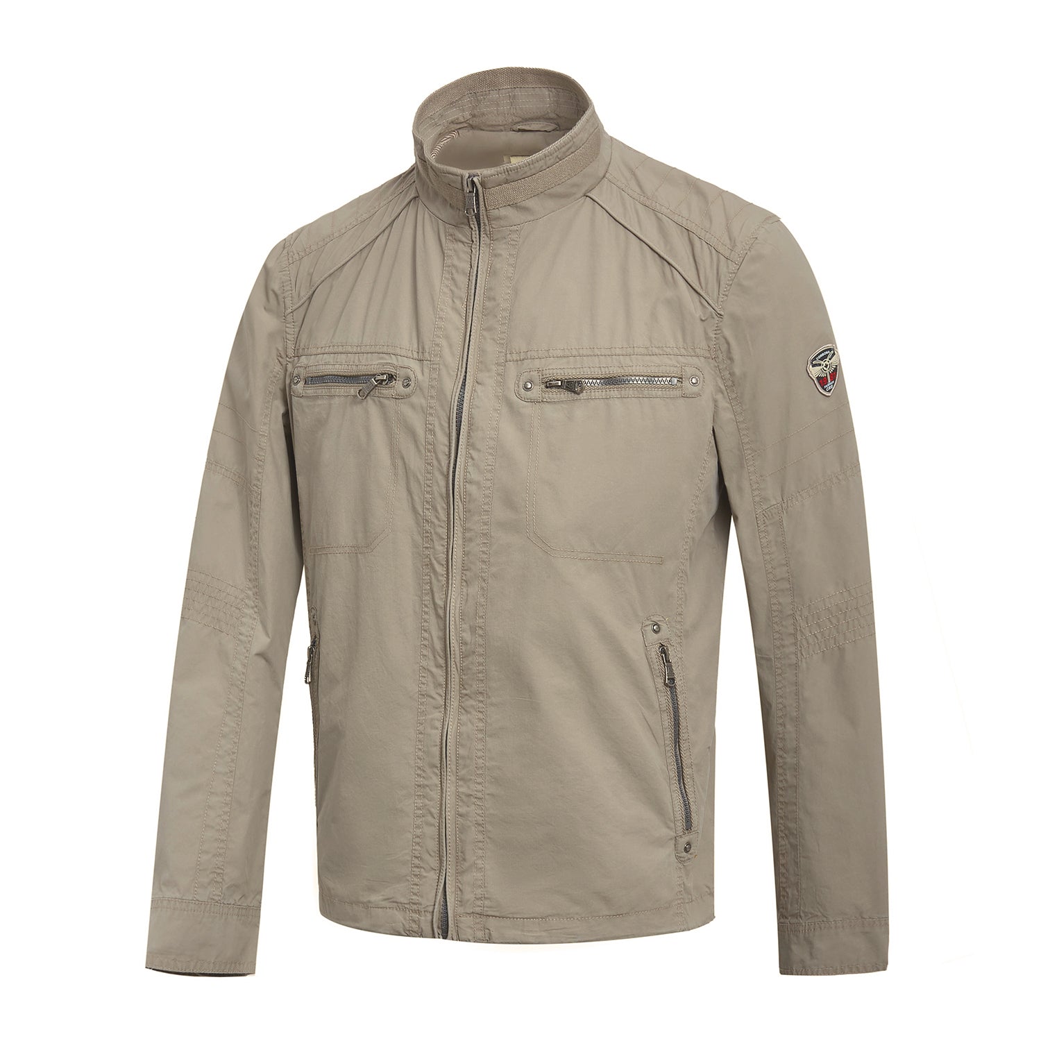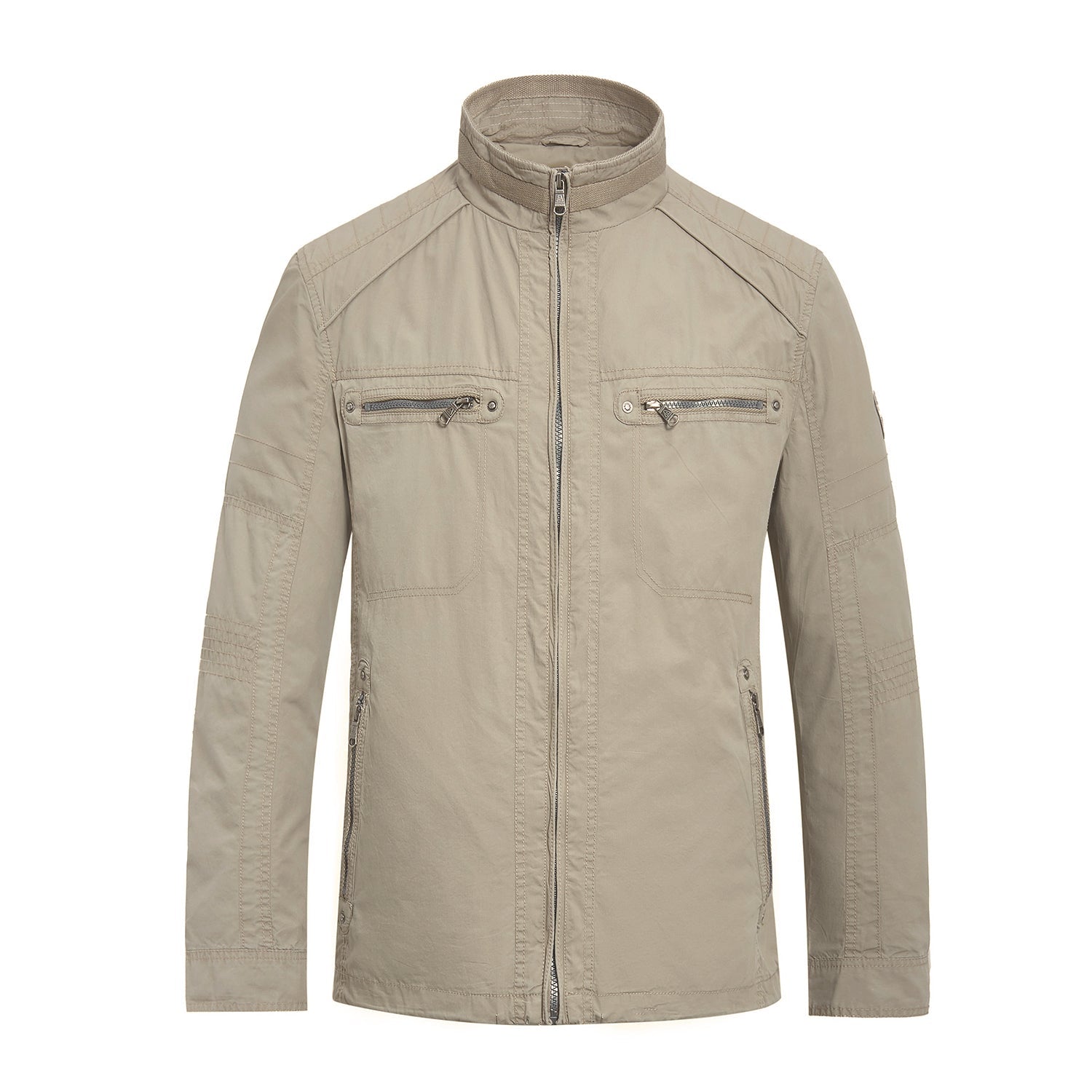 The jacket made of cotton fabric with front zip closure. High collar with long sleeves and adjustable cuffs. Totally has six zip pockets at side. chest and inside.