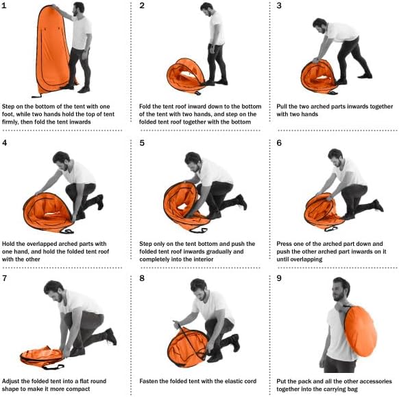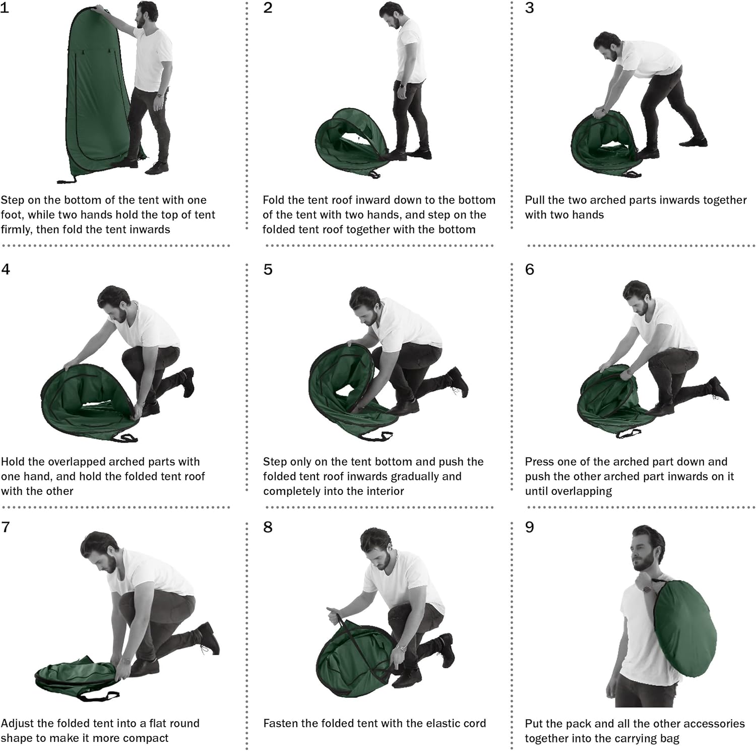 • POP UP INSTALLATION - This tent automatically pops open in seconds with no assembly required. The dual-sided zippered door of this portable shower tent can be shut for privacy or rolled and held open with the attached loop and toggles.