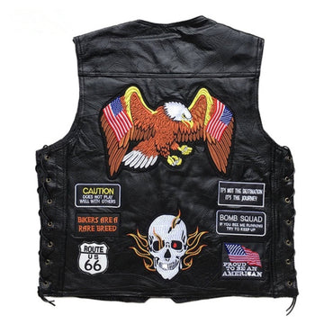 This is a perfect vest for motorcyclist enthusiasts! Want tocreate a layered outfit? It features23 patches. black snaps. and laced sides. This American Eagle 23 Patches Leather Vestis skillfully designed and sewn. patchwork leather. Motorcyclist Enthusiasts! Sleeveless Leather Vest is...