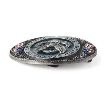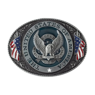 Description This Soaring Eagle American Pride Belt Buckle shows your American Pride with this statement belt buckle. A flying bald eagle flies over a picture of the United States that is painted with the American Flag pattern on it. Let...