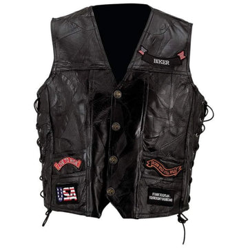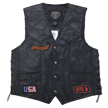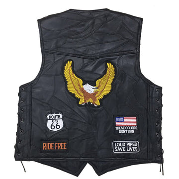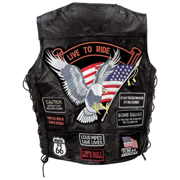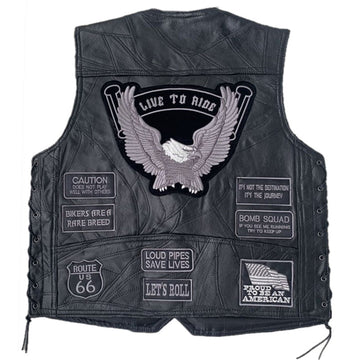 Men's Live To Ride Leather Vest ismade of lightweight patch leather with side laces for sizing and 14 presewn patches with a large Live to Ride Eagle patch holding an American flag on the back with buffalo nickel head snap...