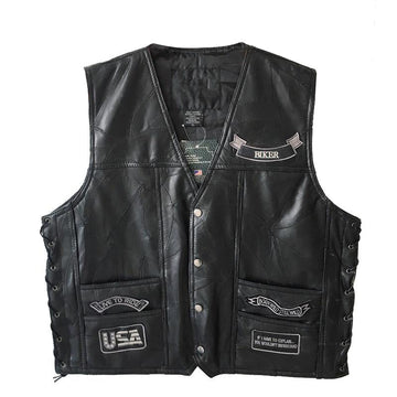 This is a perfect vest for motorcyclist enthusiasts! Want tocreate a layered outfit? It features42 patches. black snaps. and laced sides. This Espnman Leather Vest with 42 Patches is skillfully designed and sewn. patchwork leather. Motorcyclist Enthusiasts! Sleeveless Leather Vest is...