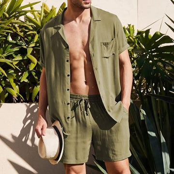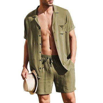 Men's Lapel Pocket Short Sleeve Shirt Shorts Set
