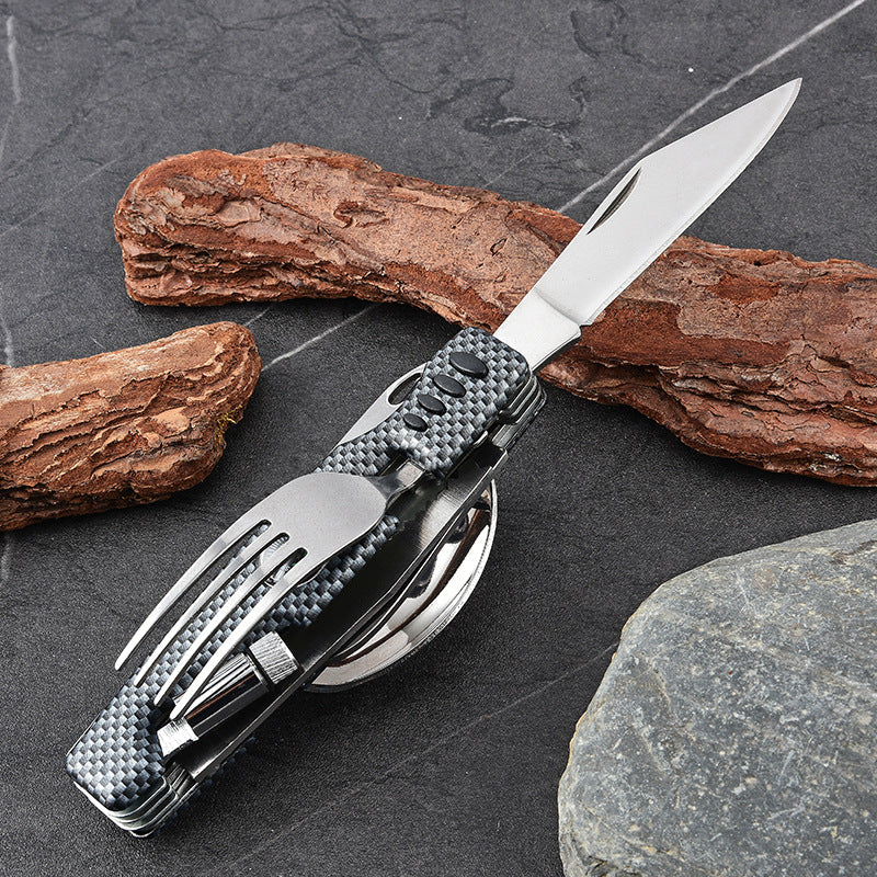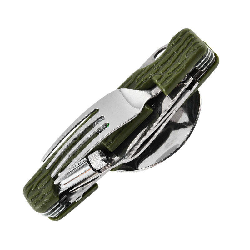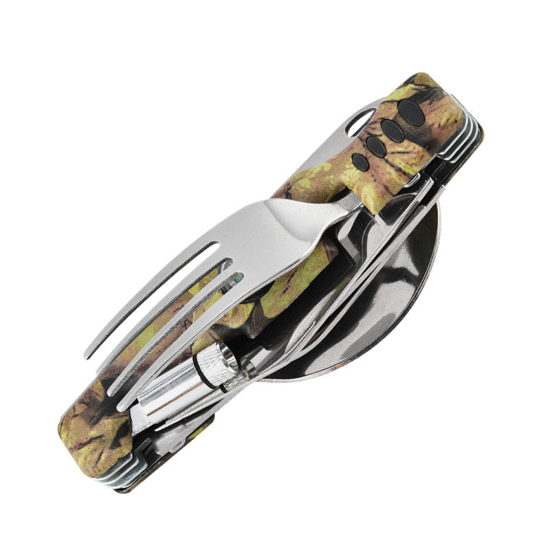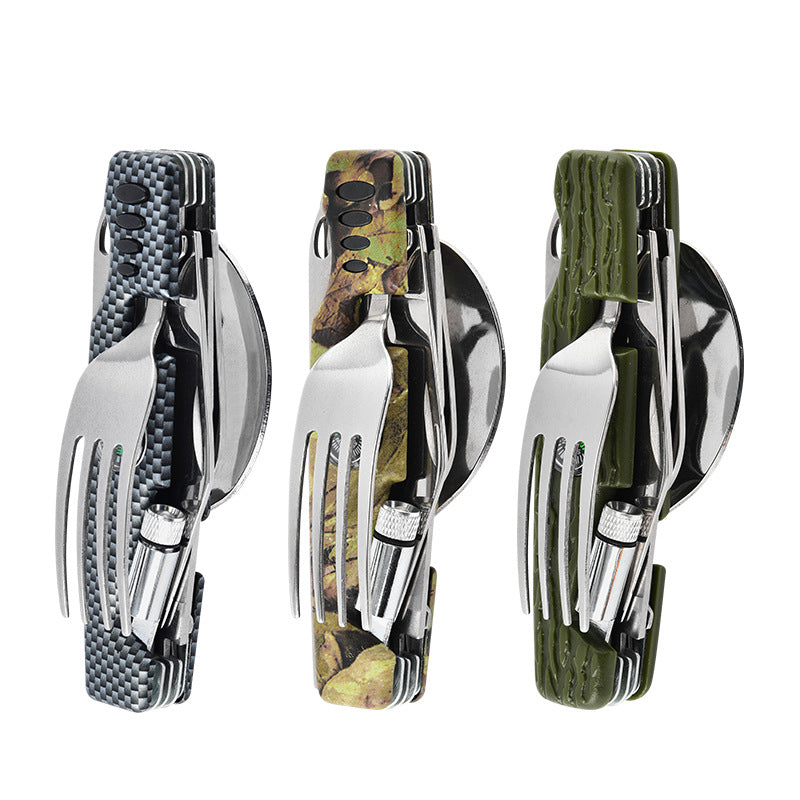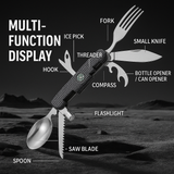 Multifunctional Stainless Steel Outdoor Utensil Set – Knife, Fork, Flashlight & Compass