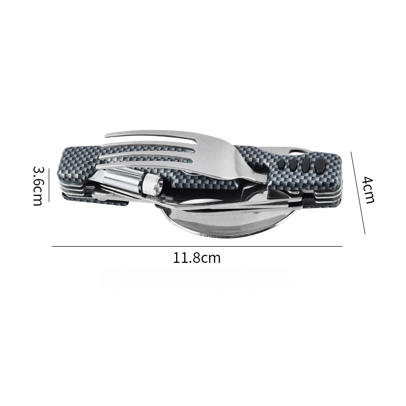 Stay prepared wherever you roam with this multifunctional outdoor utensil set. Made from durable stainless steel, this compact tool kit combines a knife, fork, flashlight, and compass – everything you need for a safe and convenient adventure.