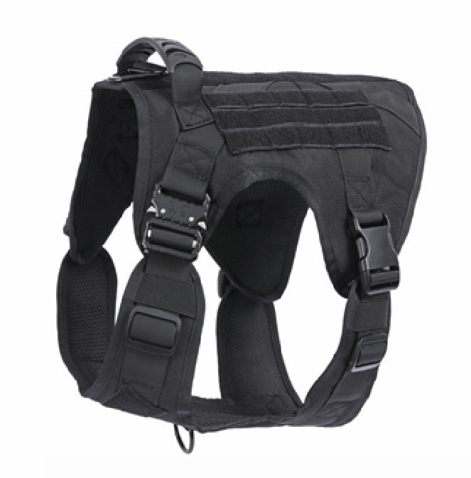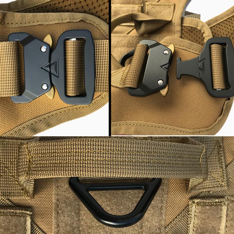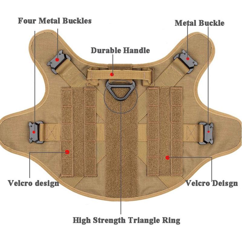 This high quality Adjustable Tactical Dog Harness Vest With Handle comes with a strong inner webbing that is breathable to enhance the comfort of your dog. The material used is military 1050D nylon. which is one of the strongest materials in the market today. It has straps on the chest area and belly that are adjustable to give the dog a good fit. The straps also provide the stability needed to keep your dog comfortable during any outdoor activity. It also has a MOLLE system on the sides where you can put pouches. magazines etc. It is available in varying chest and neck sizes that you can choose from depending on your dog's size.