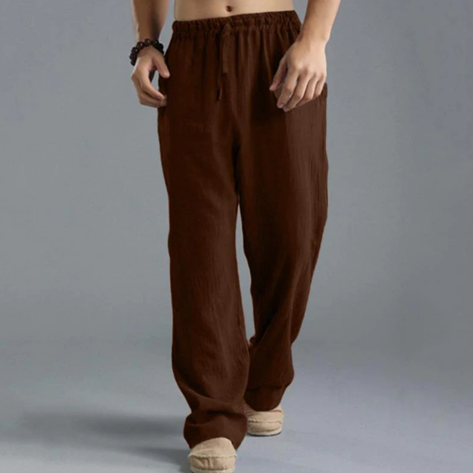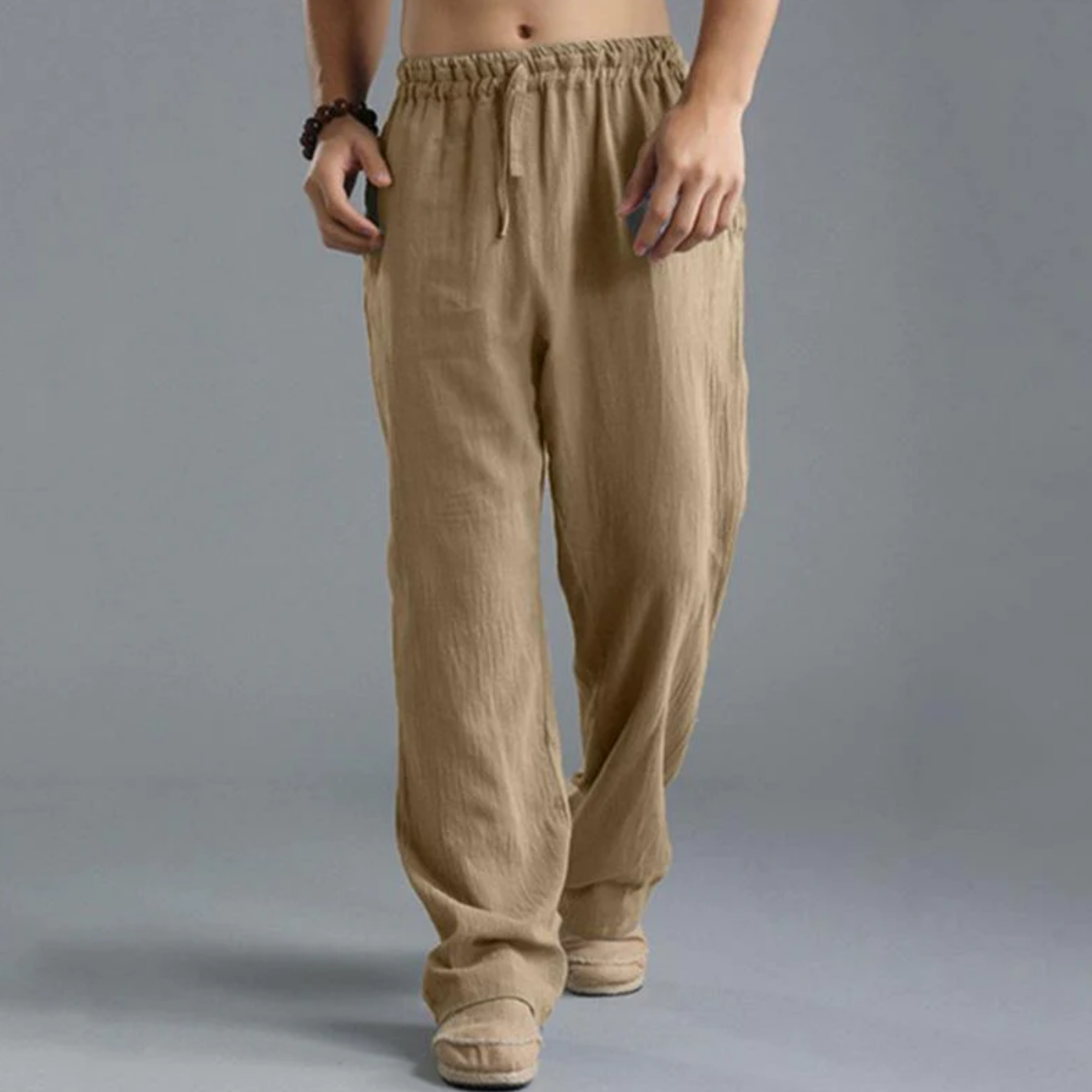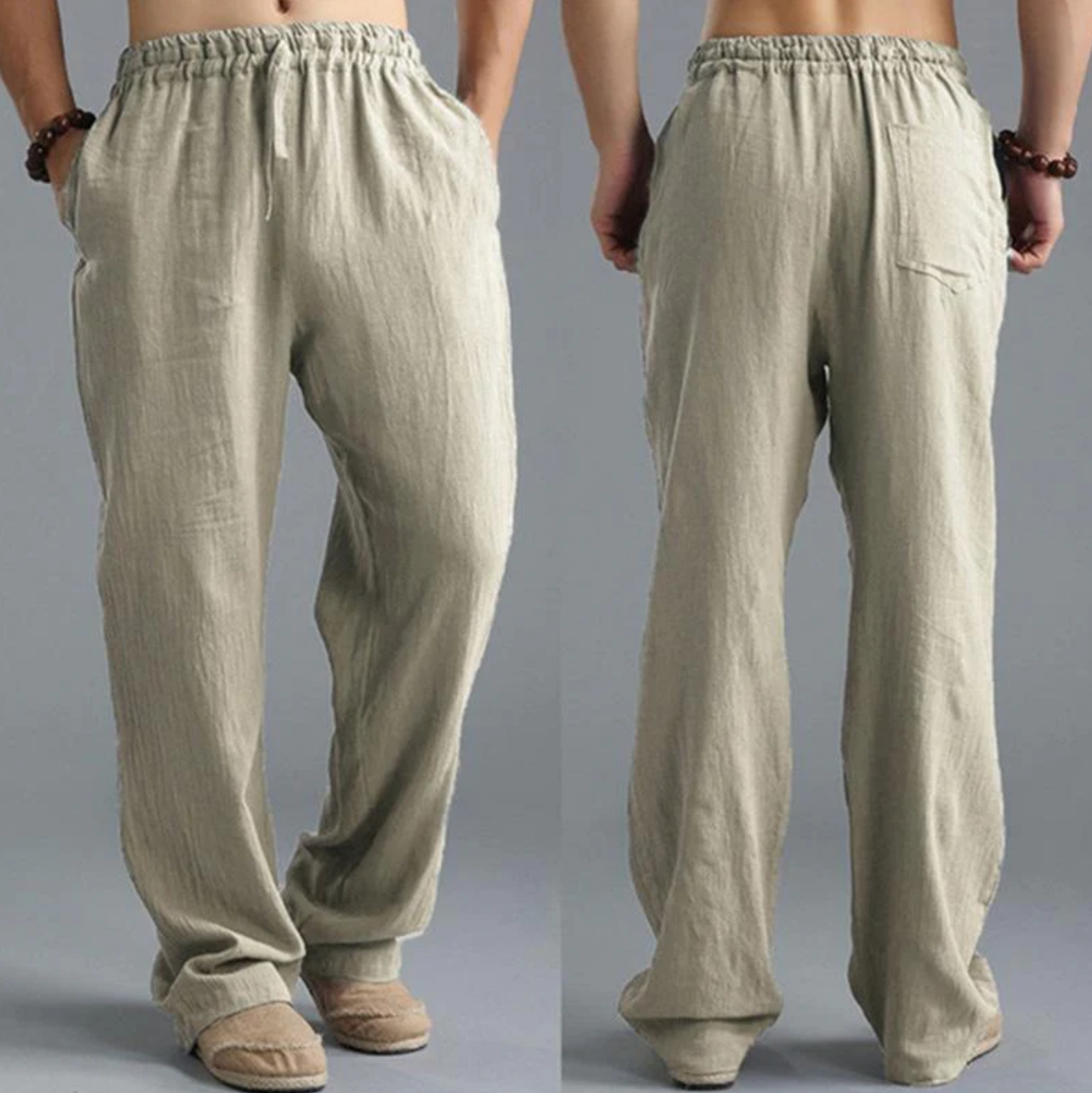 These trousers are crafted with a high-quality blend of cotton and linen fabric. The cotton offers softness and comfort, while the linen adds durability and breathability. The combination of these materials ensures a lightweight and airy feel, perfect for warmer weather.